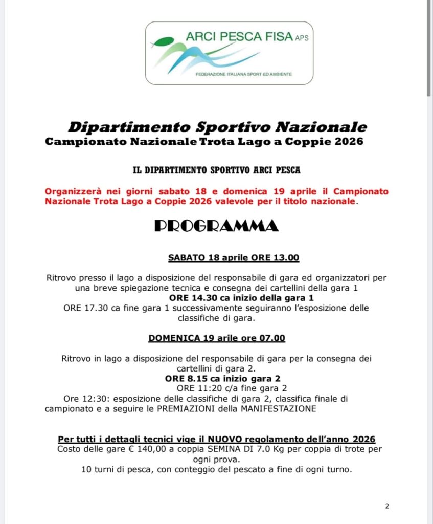 Di seguito la loncandina del 7° campionato nazionale a coppie Trota lago che si svolgerà il 18 e 19 aprile 2026 a Martinengo.